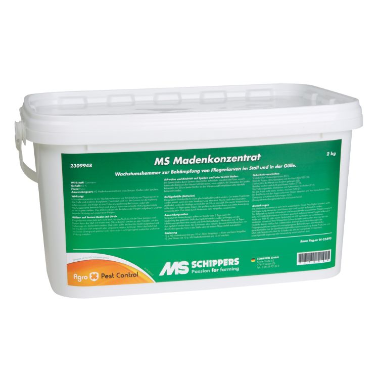 MS Maggot Death koncentrat je namijenjen za primjenu na stajnjaku i / ili drugim mjestima gdje se muhe mogu razmnožavati unutar objekata za držanje životinja. Učinak neće biti odmah vidljiv, jer aktivna tvar djeluje samo na ličinke, a na postojeće odrasle muhe nema utjecaja. Primijetiti ćete smanjenje broja muha nakon tri tjedna. Nije potrebno uklanjati stoku iz objekta tijekom nanošenja proizvoda.